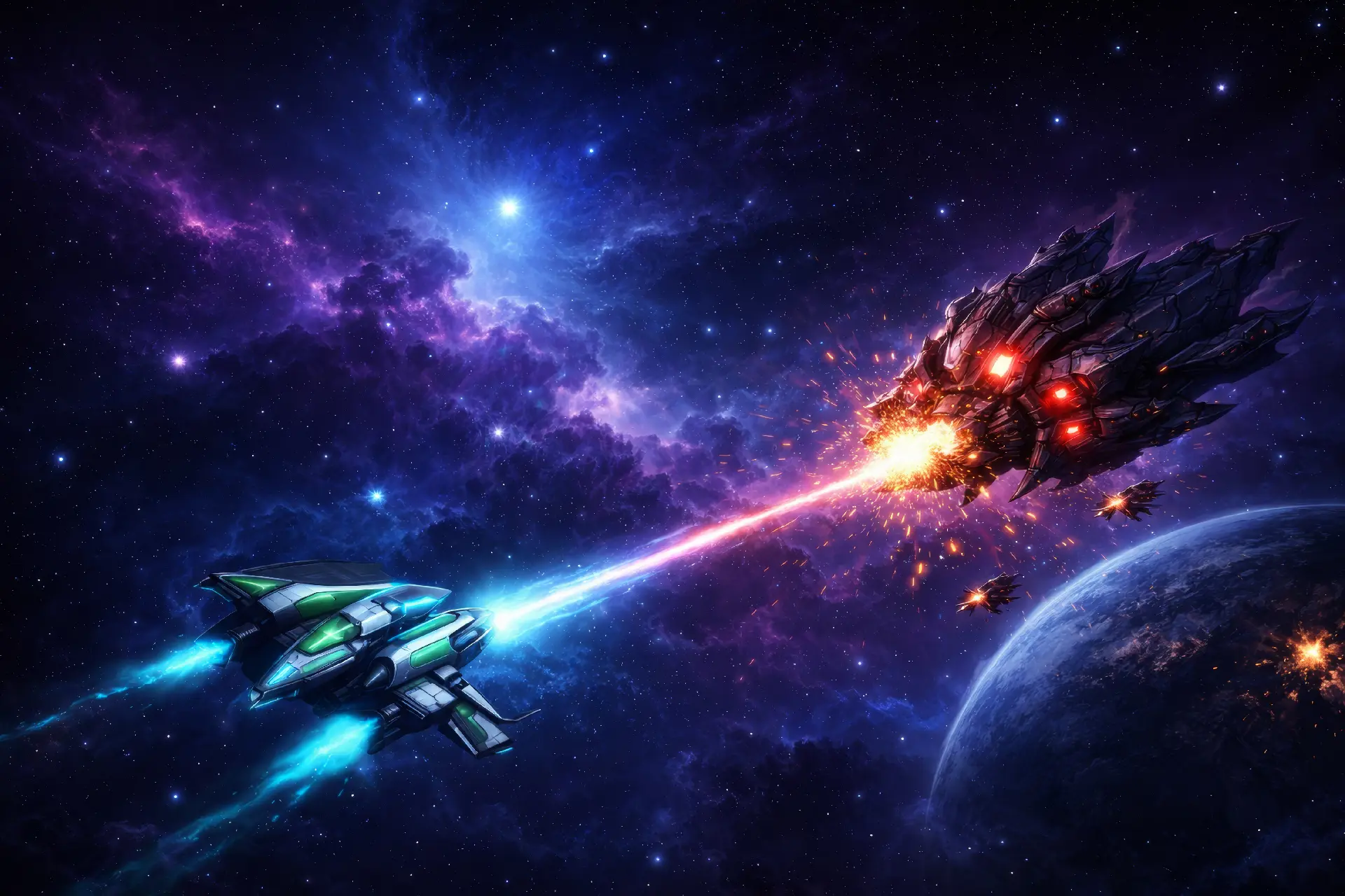Le Croiseur Laser charge 2 secondes — le telegraph vous suit en temps réel. Esquivez dans les derniers instants ou absorbez un dommage massif.